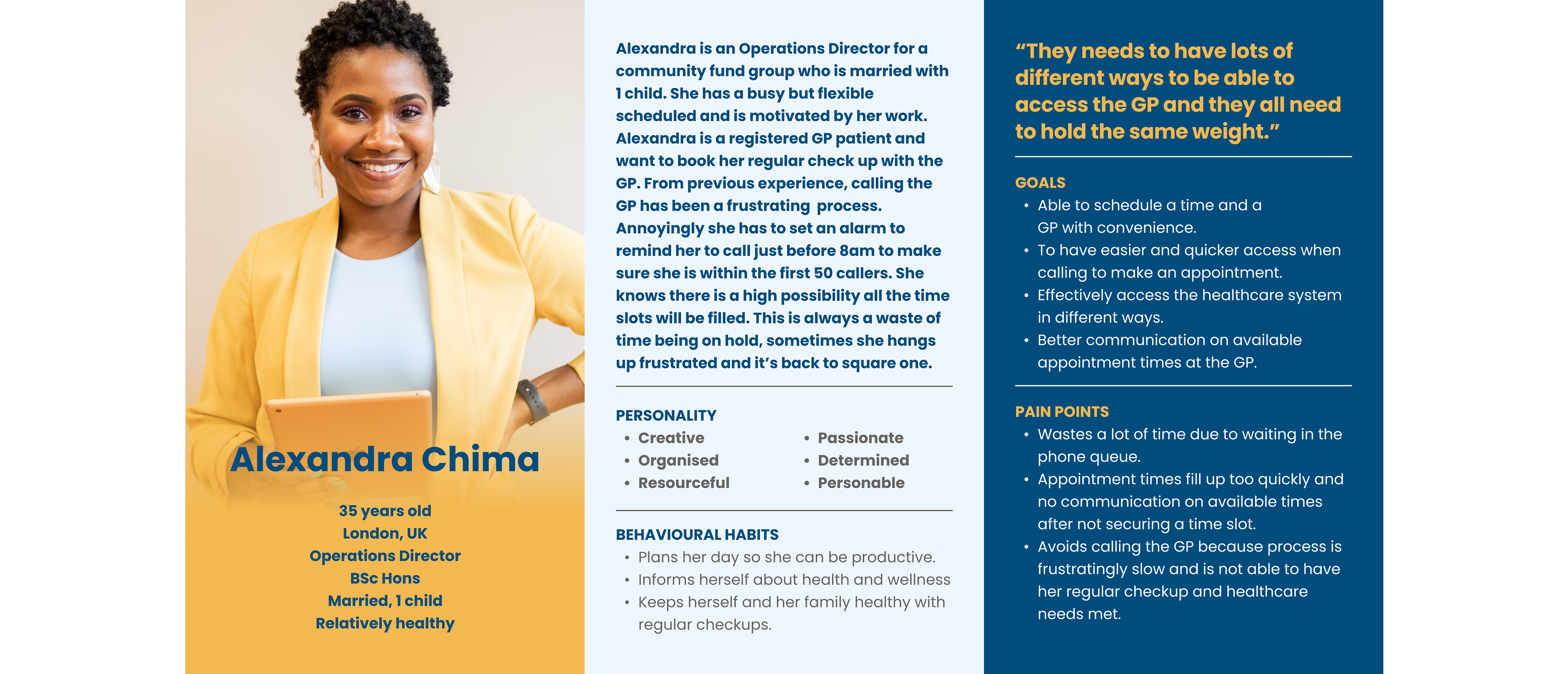 For a better understanding of the issues in this space, I sat with a few people to to get clarification on their frustrations when accessing healthcare through their GP. My objective was to: